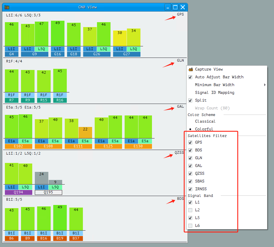 4. At this point, power off the P-7 and then power it on again. Open the CN0 View window to observe the signal strength of the received satellites. Right-click in this window and select all satellite systems, and check both the L1 and L5 bands. You may need to wait approximately 5–10 minutes in an open outdoor area for all constellations to lock in.